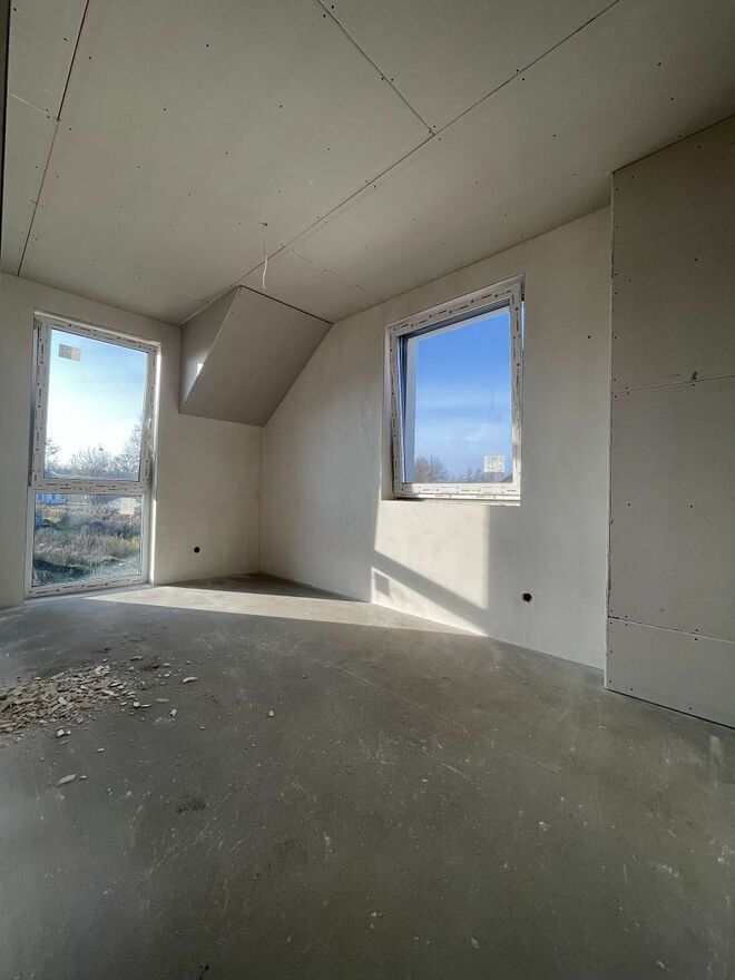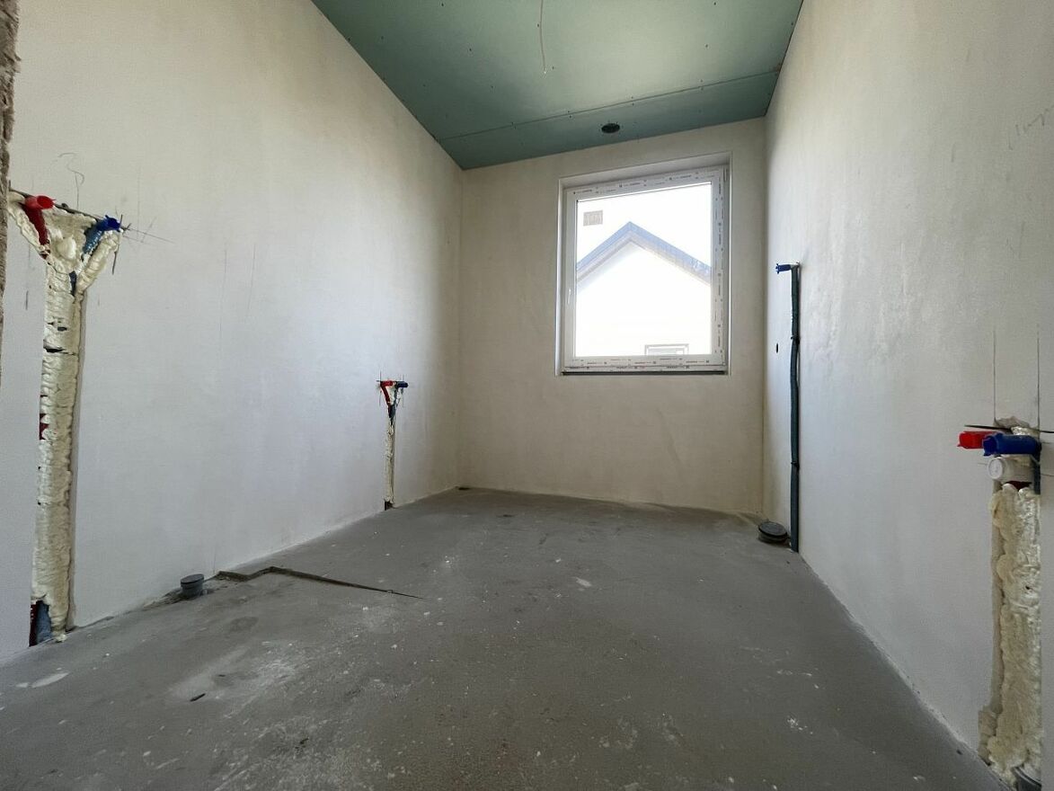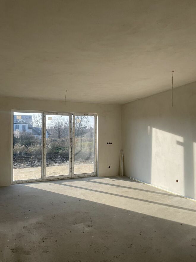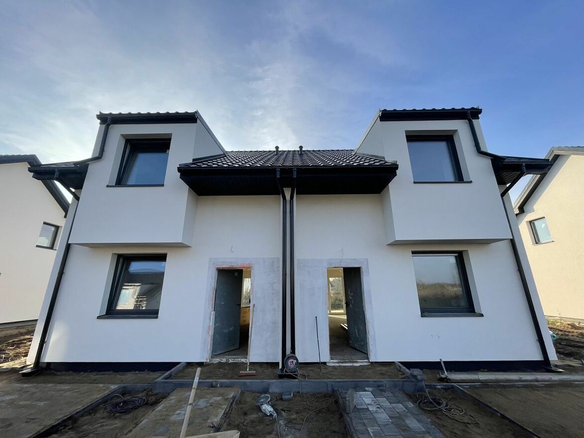 Dom bliźniaczy wybudowany w 2025 r. Wykonany z betonu komórkowego, ocieplony styropianem, elewacja wykończona tynkiem silikonowym. Dach dwu spadowy z lukarnami, pokryty dachówką ceramiczną. Zamontowana pompa ciepła, oraz szambo. Wstawione okna trzy szybowe. Wokół budynku wyłożona kostka brukowa. Gminna woda, gaz i energia podłączone do budynku. Działka o powierzchni 500 m2, możliwość wykonania tarasu, aranżacji ogrodu i postawienia domku gospodarczego. Przed budynkiem miejsce postojowe.